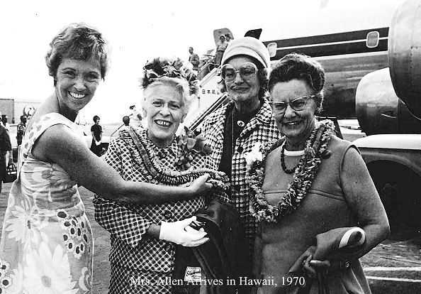 In January 1961, Pearl Jensen, another military wife and friend of Mrs. Allen, arrived in Hawaii. She attended an ikebana exhibit at Shirokiya Department Store and met local arrangers from Enshu, Ikenobo, Koryu, Ohara, and Sogetsu schools. Along with several ikebana teachers and other military wives, she was instrumental in forming the first Ikebana International chapter in Honolulu. She was the first president to preside over the new chapter at a meeting at the Reef Hotel in September 1961.